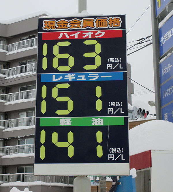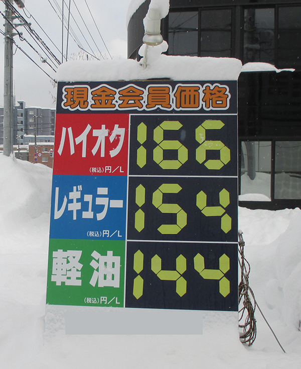 札幌市場では、マージンの減少に危機感を抱く販売業者の多くが今年に入って早々の1月5日頃から3円程度の値戻しに動き、レギュラーガソリン看板価格はフルで150円から154円まで、セルフで147円ほどが主流となったが、この時は徐々に値を下げながら130円台看板を掲げるようになった量販セルフに引きずられる形で値崩れ。その後、連休明けの13日頃から再び仕切り上昇分の50銭に3円ほどを乗せた値戻し、さらに26日頃からは仕切り上昇分3円そのままの転嫁が進展した。