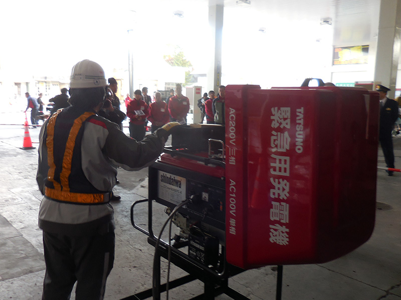 また、緊急用発電機の起動や電源切り替えに当たっては、タツノ旭川営業所の柴田貴章所長が手順を説明するなど、訓練のもうひとつの目的である計量機メーカーなどのバックアップ体制の整備も検証した。